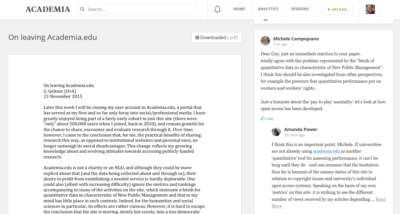 The latter contingency is important. In stressing it, many users acknowledged that Academia.edu’s financial future can take many shapes, and contributions to the Session routinely imagined and responded to such eventualities. For instance, academic job ads are currently the site’s only revenue source, according to a comment made by Richard Price, its founder and CEO, on one of the discussion threads. It does not (and contrary to my mistaken assumption) sell users’ meta-data, although it hasn’t committed to not doing so in the future. Interestingly, no one during the discussion expressed themselves against selling ads or more ads, or even the potentially related sale of meta-data, which most people assume is an inevitable price to pay for surfing the web or using a free service these days (“You are the product”). To my knowledge, no survey on these funding sources’ acceptability has been conducted among Academia.edu members, but neither seems to raise too many eyebrows.